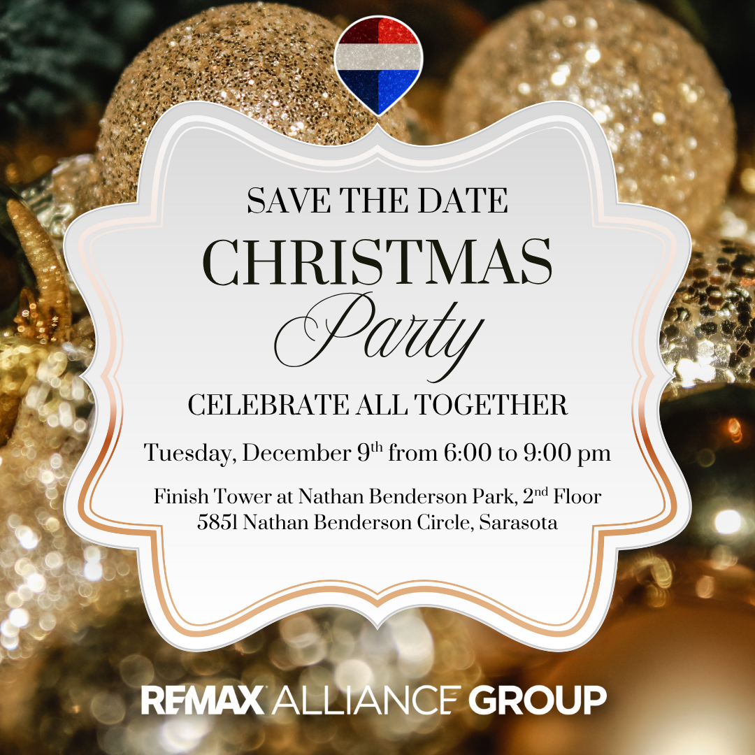 RE/MAX Alliance Group Christmas Party | Tuesday, December 9th 6-9pm | 5851 Nathan Benderson Circle, Sarasota 34235 CLICK THIS LINK to RSVP https://share.hsforms.com/21BEkbSC7RAeNs1cUMjwcXga8xh